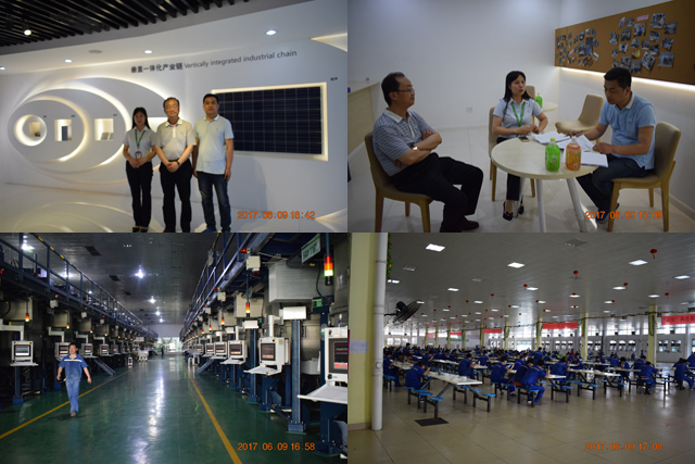晶科能源控股有限公司是全球為數(shù)不多的擁有垂直一體化產(chǎn)業(yè)鏈的光伏制造企業(yè),業(yè)務(wù)涵蓋了優(yōu)質(zhì)的硅錠、硅片、電池片生產(chǎn)、高效單多晶光伏組件制造以及光伏電站建設(shè)等領(lǐng)域,是目前全球光伏組件生產(chǎn)的龍頭企業(yè),2016年中國500強企業(yè)。公司負責人帶領(lǐng)考察人員參觀了公司現(xiàn)代化的生產(chǎn)車間、晶科商學院、員工宿舍和食堂,介紹了公司的發(fā)展情況和用人需求。在考察過程中,考察人員就公司給學生提供的工作崗位、待遇、住宿、安全管理等情況與企業(yè)負責人進行了深入交流。