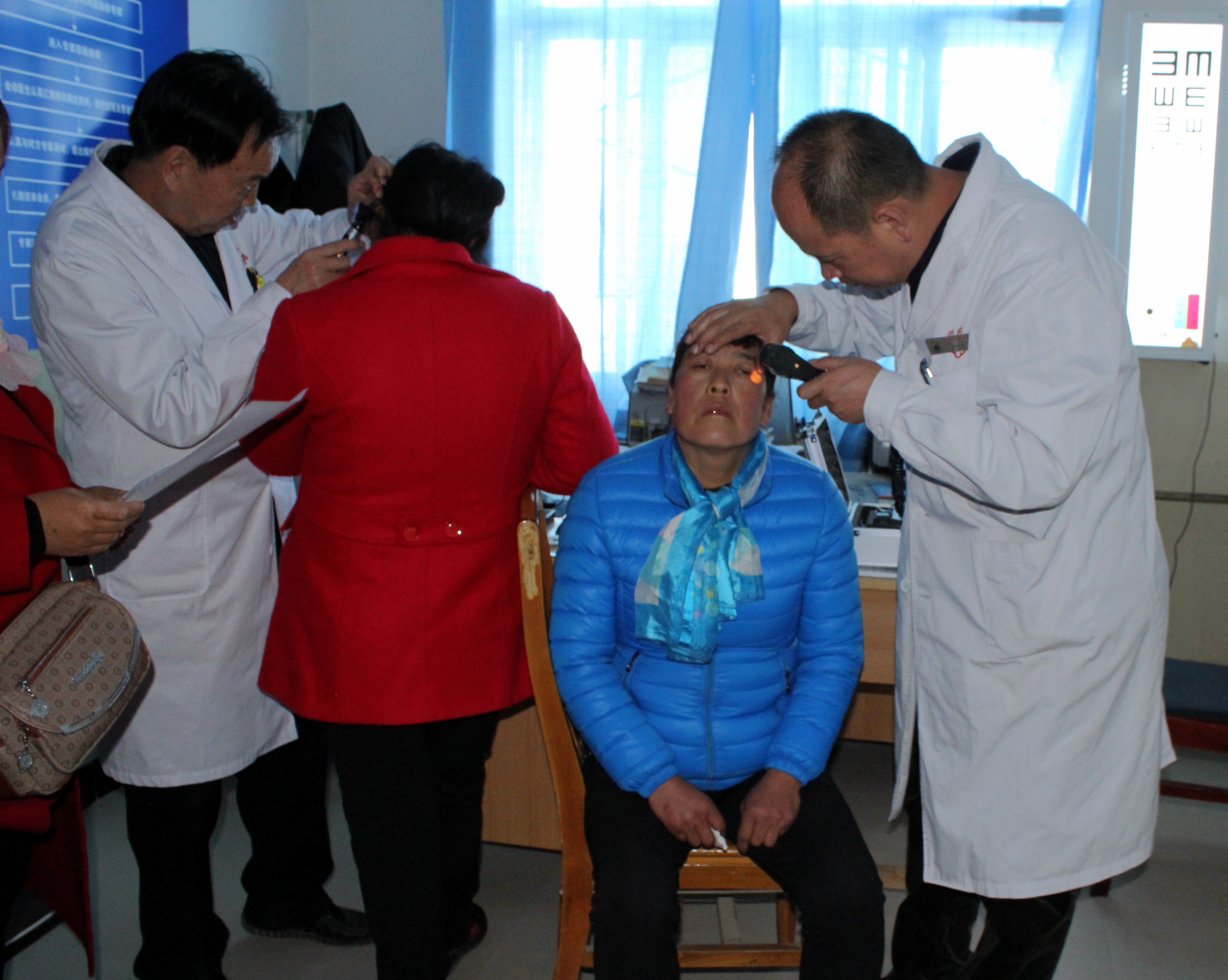 在衛(wèi)生院內(nèi)義診現(xiàn)場,由于診室面積所限,患者們遵照護士安排意見,按病種分成兩組排隊候診。陶醫(yī)生為患有干眼癥、結(jié)膜炎、白內(nèi)障、青光眼、翼狀胬肉、斜視等眼科疾病的患者開展常規(guī)檢查,并開具處方,提供健康用眼衛(wèi)生和治療方案。王醫(yī)生為患者提供耳鼻喉常規(guī)檢查服務(wù)。對于患有中耳炎、慢性咽炎、耳鳴耳聾、過敏性鼻炎等疾病的患者,王醫(yī)生現(xiàn)場給予用藥指導(dǎo)和今后的治療方案。