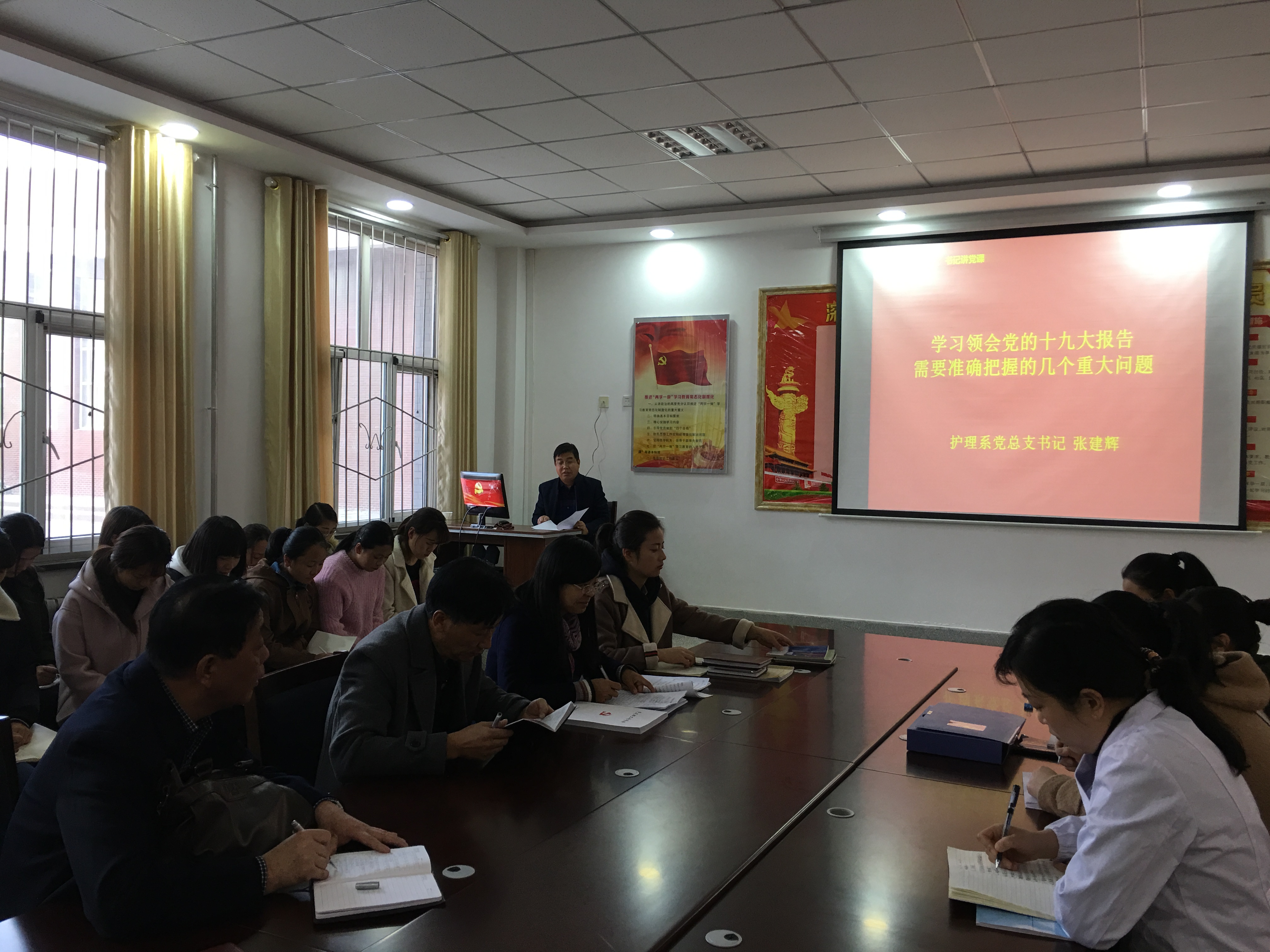 11月17日,護(hù)理系黨支部支召開全體黨員大會,黨總支書記張建輝講黨課,就《學(xué)習(xí)領(lǐng)會黨的十九大報告需要準(zhǔn)確把握的幾個重大問題》進(jìn)行專題黨課輔導(dǎo),促進(jìn)全體黨員對十九大精神的學(xué)習(xí)理解。護(hù)理系入黨積極分子聆聽了黨課。