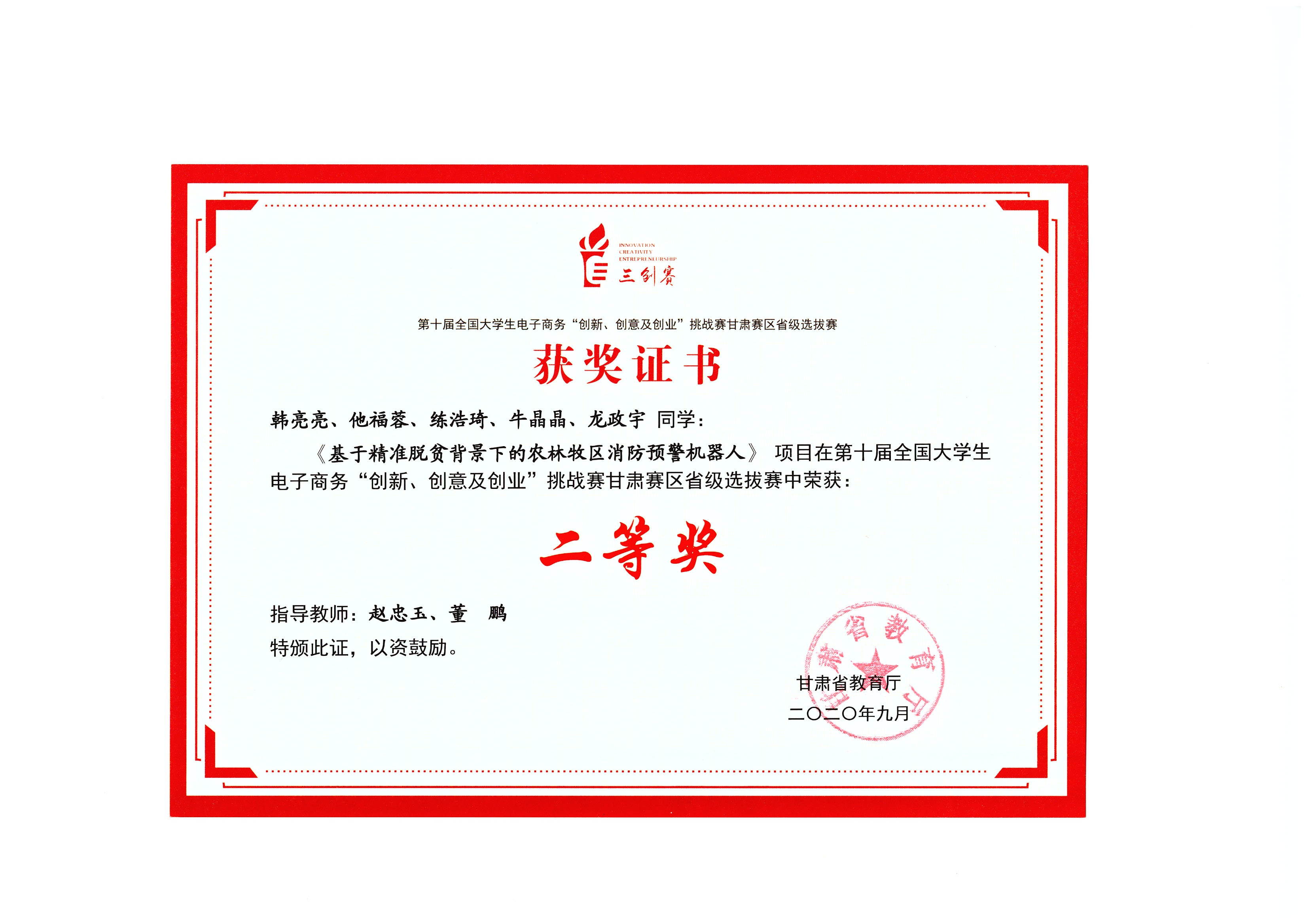 第十屆全國(guó)大學(xué)生電子商務(wù)“創(chuàng)新、創(chuàng)意及創(chuàng)業(yè)挑戰(zhàn)賽甘肅省賽區(qū)省級(jí)選拔賽《基于精準(zhǔn)脫貧背景下的農(nóng)林牧區(qū)消防預(yù)警機(jī)器人》