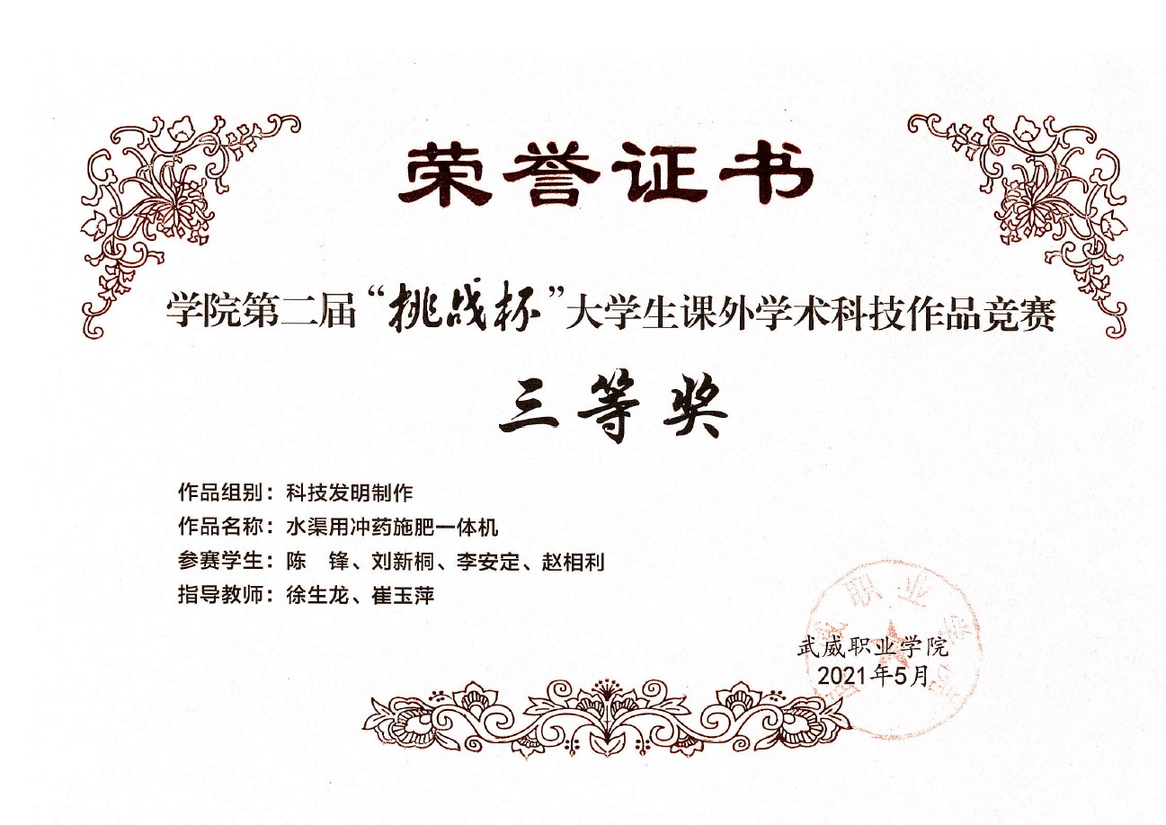 武威職業(yè)學(xué)院第二屆“挑戰(zhàn)杯”大學(xué)生課外學(xué)術(shù)科技作品《水渠用沖藥施肥一體機(jī)》