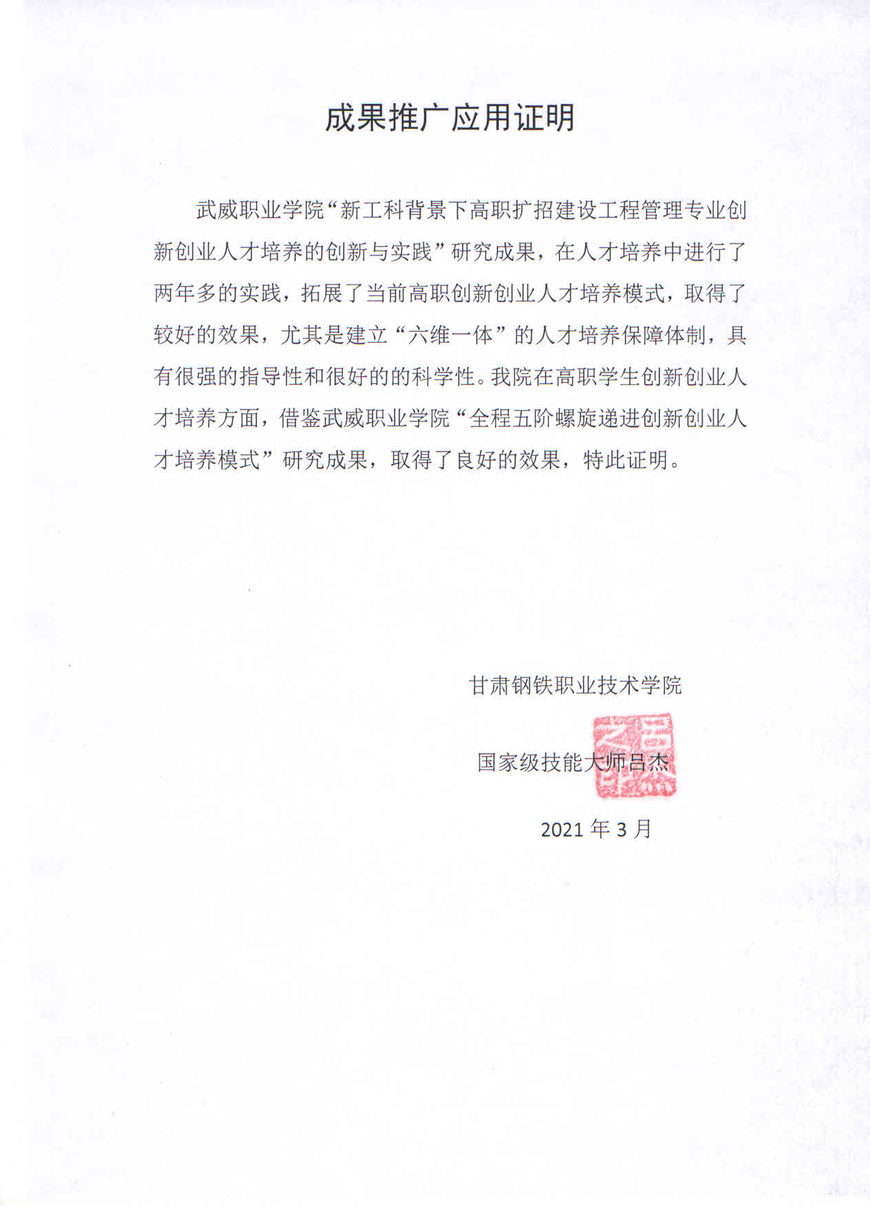 成果推廣應(yīng)用證明(甘肅鋼鐵職業(yè)技術(shù)學(xué)院、國家級(jí)技能大師呂杰)