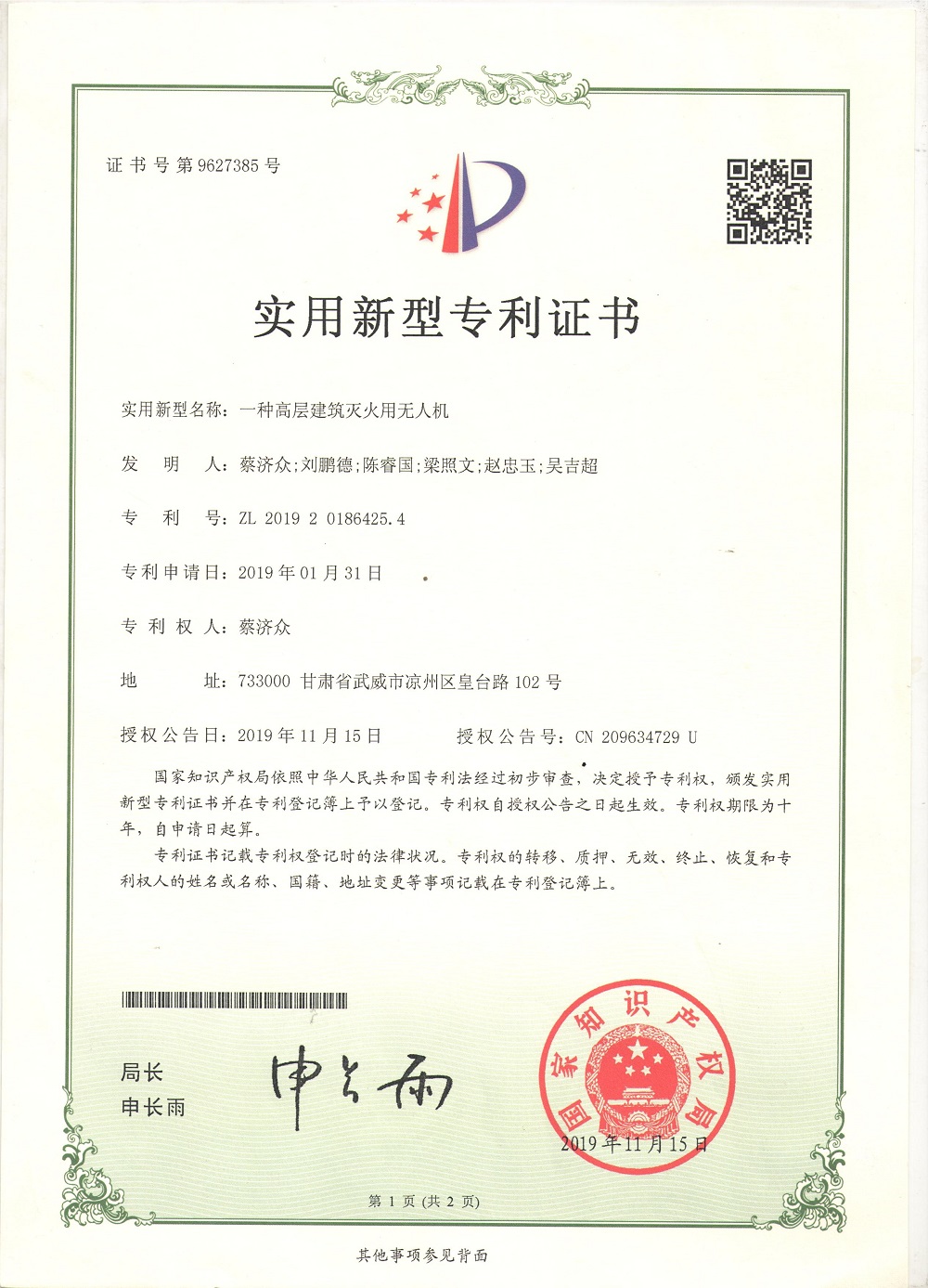 2019年10月項(xiàng)目組成員蔡濟(jì)眾、陳睿國獲得國家實(shí)用性專利授權(quán)1項(xiàng)