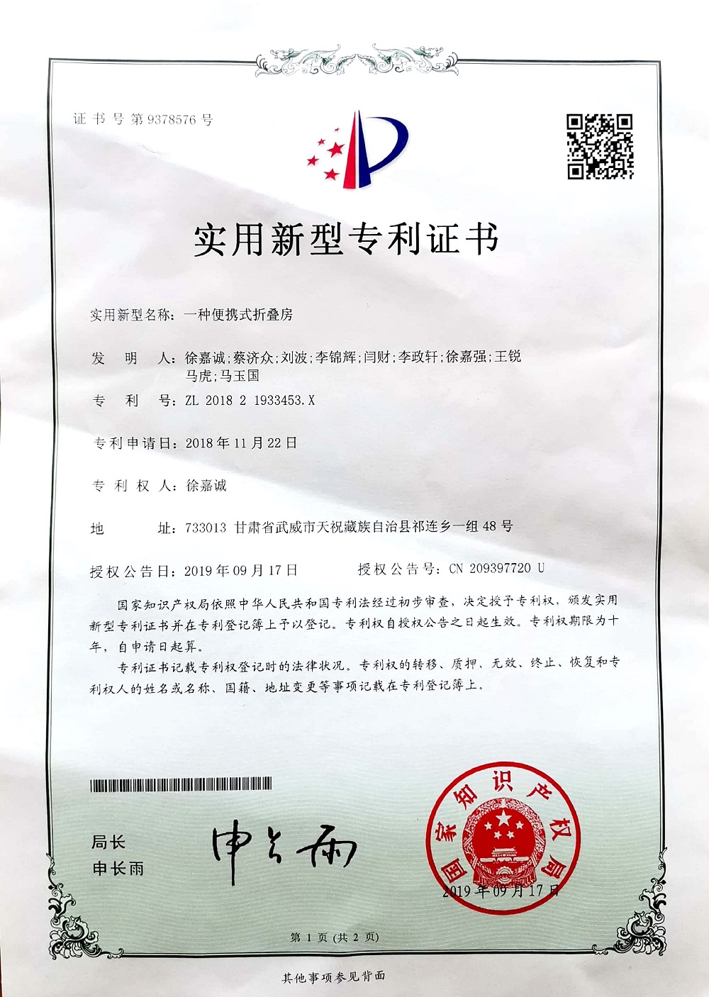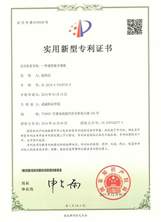 2019年12月項(xiàng)目組成員趙特慶獲得國家實(shí)用性專利授權(quán)1項(xiàng)